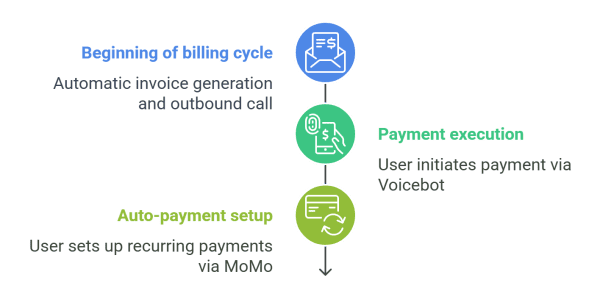 Voicebot (calling the Billing system API): "Of course. I have submitted the request to set up automatic payments. Please open your MoMo app to authorize recurring payments for the Electricity Company. Starting next month, your bill will be automatically deducted from your MoMo wallet on the 15th.". The utility's Billing System then saves this "authorized for autopay" status for the corresponding customer ID.