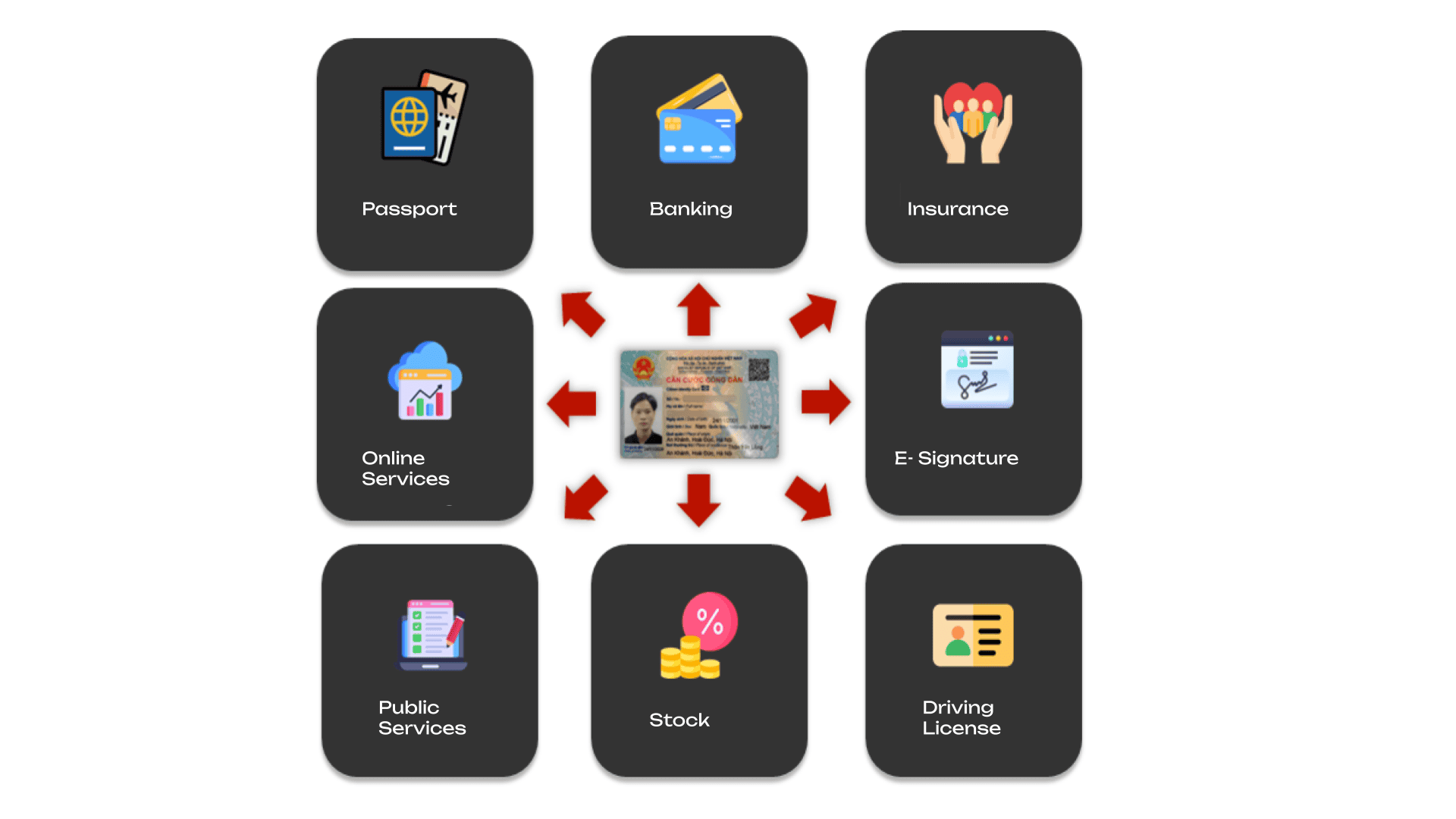 - Public and online services provide access to various government and digital services with verified identity.