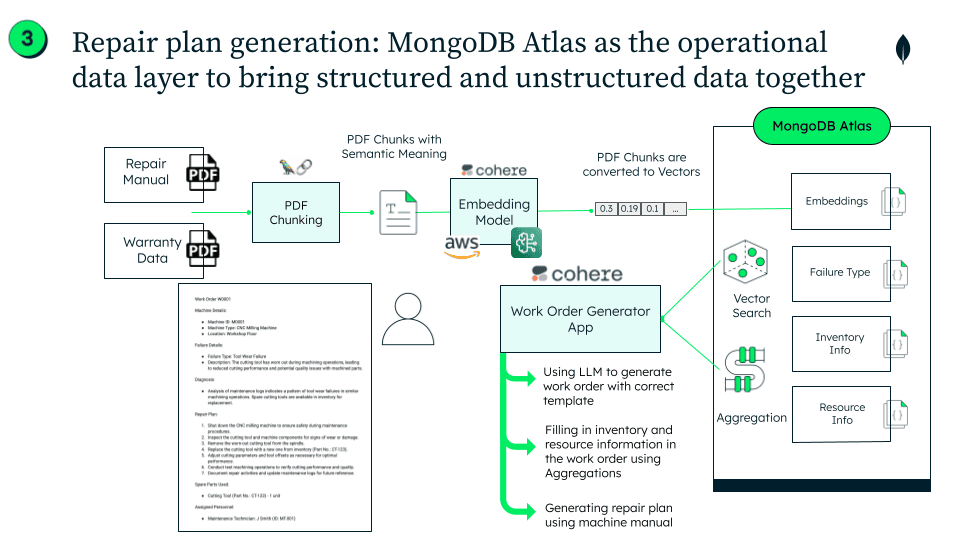 Deploying end-to-end predictive maintenance solutions presents challenges such as data silos, inconsistent documentation, and skill-level variances. MongoDB Atlas and AWS provide a unified platform that integrates structured and unstructured data, enabling seamless AI implementation. By leveraging a combination of AI models, vector search, and automation, manufacturers can overcome these obstacles and unlock the full potential of predictive maintenance.