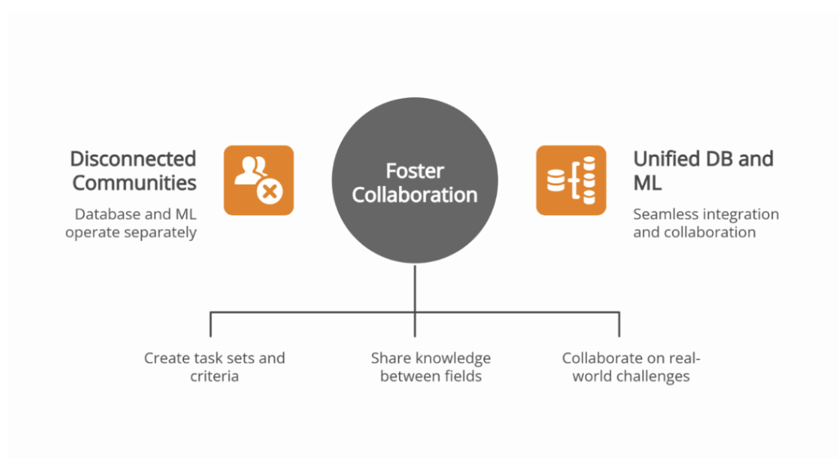 Achieving true DBfication requires unprecedented collaboration between database and ML communities. Kumar advocates for several key initiatives:
