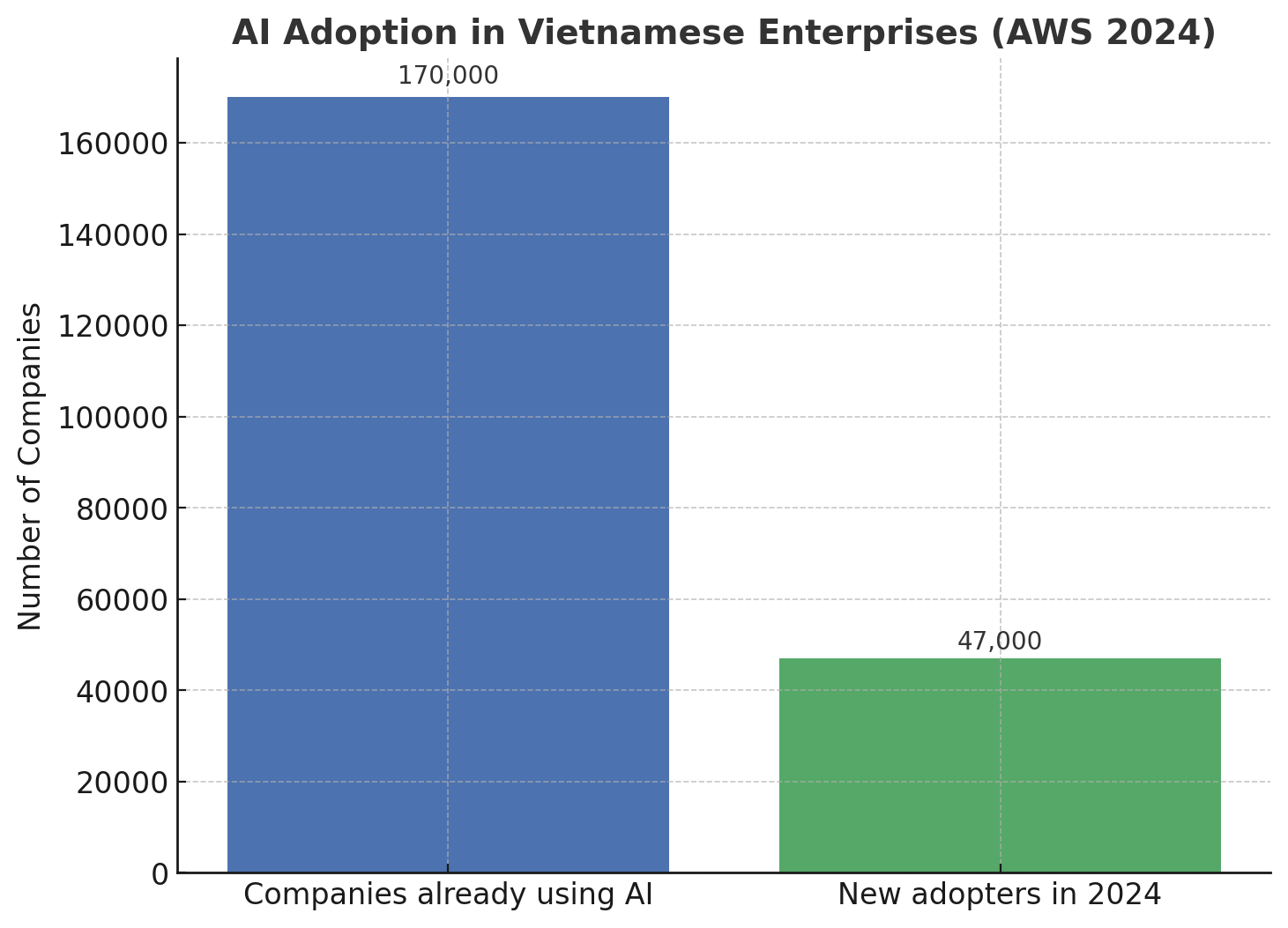 In recent years, AI has become an inevitable trend in enterprise digital transformation. According to a study published by Amazon Web Services (AWS), 18% of businesses in Vietnam have implemented AI, equivalent to nearly 170,000 companies, marking a 39% increase compared to the same period last year. In 2024 alone, about 47,000 businesses began applying AI, with an average of 5 new businesses joining this trend every hour.